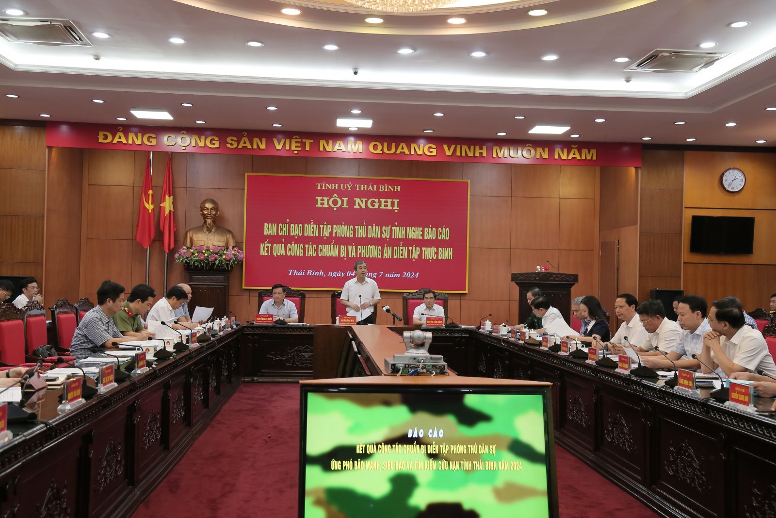 00:00 ngày 04/07/2024 | lượt xem: 387 Ban Chỉ đạo diễn tập phòng thủ dân sự tỉnh nghe báo cáo kết quả công tác chuẩn bị và phương án diễn tập thực binh Chiều ngày 4/7, Ban Chỉ đạo diễn tập Phòng thủ dân sự tỉnh (PTDS) tổ chức hội nghị nghe báo cáo kết quả công tác chuẩn bị và phương án diễn tập thực binh.Đồng chí Ngô Đông Hải, Ủy viên Ban Chấp hành Trung ương Đảng, Bí thư VV88 casino, Trưởng ban Chỉ đạo diễn tập PTDS tỉnh phát biểu tại hội nghị.Các đồng chí: Ngô Đông Hải, Ủy viên Ban Chấp hành Trung ương Đảng, Bí thư VV88 casino, Trưởng ban Chỉ đạo diễn tập; Nguyễn Tiến Thành, Phó Bí thư thường trực VV88 casino, Chủ tịch HĐND tỉnh, Phó Trưởng ban chỉ đạo diễn tập; Nguyễn Khắc Thận, Phó Bí thư VV88 casino, Chủ tịch UBND tỉnh, Phó trưởng ban thường trực Ban Chỉ đạo, Trưởng ban Tổ chức diễn tập chủ trì hội nghị. Dự hội nghị có các đồng chí Ủy viên Ban Thường vụ VV88 casino, lãnh đạo HĐND, UBND tỉnh; lãnh đạo các sở, ban, ngành, đơn vị, địa phương liên quan.Các đồng chí Ủy viên Ban Thường vụ VV88 casino dự hội nghị.Cuộc diễn tập mang đề mục “Tỉnh Thái Bình phối hợp với Quân khu 3 và các lực lượng có liên quan tổ chức phòng thủ dân sự ứng phó bão mạnh, siêu bão và tìm kiếm cứu nạn". Diễn tập được chia làm 2 giai đoạn, trong đó giai đoạn 1 diễn tập vận hành cơ chế, có một phần thực binh; giai đoạn 2, thực hành ứng phó bão mạnh, siêu bão và tìm kiếm cứu nạn. Quy mô cuộc diễn tập được thực hiện ở 3 cấp tỉnh, huyện, xã. Ứng phó bão mạnh, siêu bão ở cấp độ 2; huy động 2.570 người, 285 phương tiện các loại, gồm các đơn vị của Bộ Quốc phòng, Quân khu 3, các sở, ban, ngành, lực lượng vũ trang của tỉnh và các huyện Tiền Hải, Thái Thụy, Vũ Thư và thành phố Thái Bình.Đại tá Nguyễn Ngọc Tuệ, Ủy viên Ban Thường vụ VV88 casino, Chủ huy trưởng Bộ CHQS tỉnh báo cáo kết quả công tác chuẩn bị diễn tập.Đến thời điểm này công tác chuẩn bị diễn tập và các phương án diễn tập thực binh đã được các cơ quan, đơn vị, địa phương phối hợp triển khai, bảo đảm theo thời gian, lộ trình, kế hoạch đề ra. Đặc biệt là trong việc tham mưu Ban Thường vụ VV88 casino, UBND tỉnh ban hành các văn bản lãnh đạo, chỉ đạo, xây dựng hệ thống văn kiện diễn tập, kịch bản tổng thể, chi tiết diễn tập; khảo sát các địa điểm diễn tập; tập huấn, bồi dưỡng khung diễn tập... Đồng thời làm tốt công tác chuẩn bị huy động lực lượng, phương tiện, vật tư, trang thiết bị tham gia luyện tập, diễn tập theo đúng kế hoạch của Ban Chỉ đạo, Ban Tổ chức diễn tập và UBND tỉnh. Đồng chí Phạm Đồng Thụy, Ủy viên Ban Thường vụ, Trưởng ban Tuyên giáo VV88 casino phát biểu tại hội nghị. Đại tá Trần Văn Phúc, Ủy viên Ban Thường vụ VV88 casino, Giám đốc Công an tỉnh phát biểu tại hội nghị.Lãnh đạo huyện Tiền Hải phát biểu tại hội nghị. Tại hội nghị, lãnh đạo các sở, ban, ngành, đơn vị địa phương đã tập trung thảo luận làm rõ các vấn đề liên quan đến công tác chuẩn bị diễn tập PTDT tỉnh. Đồng chí Ngô Đông Hải, Ủy viên Ban Chấp hành Trung ương Đảng, Bí thư VV88 casino, Trưởng ban Chỉ đạo diễn tập PTDS tỉnh phát biểu tại hội nghị.Phát biểu kết luận hội nghị, đồng chí Bí thư VV88 casino, Trưởng ban Chỉ đạo diễn tập PTDS tỉnh nhấn mạnh ý nghĩa, tầm quan trọng của cuộc diễn tập diễn ra ngay sau khi Luật Phòng thủ dân sự được VV88 casino đăng ký ban hành. Chính vì thế các cơ quan, đơn vị, địa phương liên quan cần tiếp tục đẩy mạnh công tác tuyên truyền, nâng cao nhận thức của các cấp ủy, chính quyền, lực lượng vũ trang và nhân dân về ý nghĩa tầm quan trọng, quy mô của cuộc diễn tập PTDS. Đồng chí đề nghị Bộ CHQS tỉnh làm đầu mối, chủ động rà soát, kiểm tra việc hoàn thiện các văn kiện liên quan, bảo đảm theo đúng các quy định của pháp luật, hướng dẫn của cấp trên và các cơ sở pháp lý liên quan. UBND tỉnh chỉ đạo các cơ quan, đơn vị, địa phương chuẩn bị các hệ điều kiện tổ chức diễn tập, nhất là về cơ sở vật chất, lực lượng, phương tiện; đồng thời chủ trì, phối hợp với các đơn vị liên quan, bảo đảm vận hành thống nhất, nhuần nhuyễn, hiệu quả. Các lực lượng tham gia diễn tập bám sát kế hoạch, ý định diễn tập, nắm vững các yêu cầu trong nội dung diễn tập và các vấn đề, tình huống diễn tập, trong đó tập trung nghiên cứu kỹ các nội dung liên quan để vận dụng vào thực tế nhiệm vụ, công việc của cơ quan, đơn vị; đồng thời chú trọng công tác luyện tập, góp phần tổ chức thành công cuộc diễn tập. Quá trình triển khai, tổ chức thực hiện các nhiệm vụ diễn tập, nếu có các khó khăn, vướng mắc phát sinh, các cơ quan, đơn vị, địa phương báo cáo Ban Chỉ đạo, Ban Tổ chức tháo gỡ kịp thời, bảo đảm cuộc diễn tập đạt kết quả cao. Tác