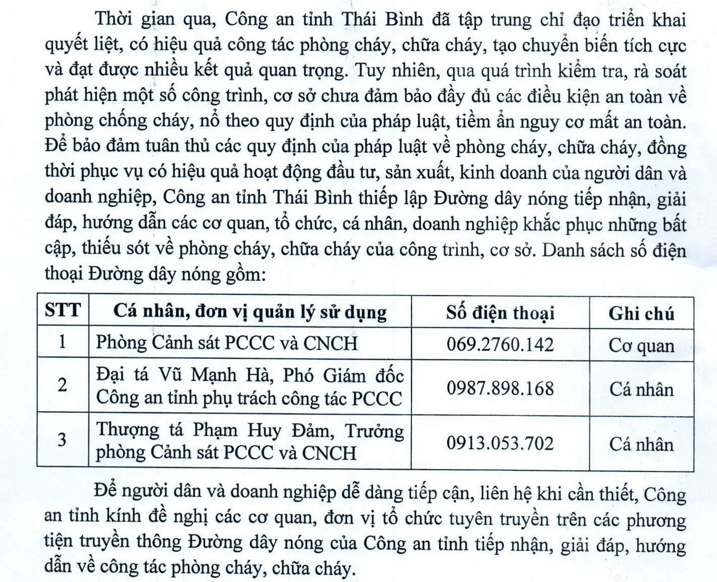 00:00 ngày 18/05/2023 | lượt xem: 384 Công bố đường dây nóng của Công an tỉnh Thái Bình tiếp nhận, giải đáp hướng dẫn về công tác PCCC Ảnh minh họa Tác giả: Theo Baothaibinh.com.vn