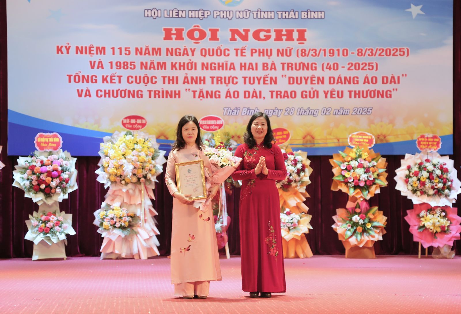 28/02/2025 | lượt xem: 425 Kỷ niệm 115 ngày Quốc tế Phụ nữ và 1985 năm khởi nghĩa Hai Bà Trưng Sáng ngày 28/2, Hội LHPN tỉnh tổ chức hội nghị kỷ niệm 115 năm ngày Quốc tế Phụ nữ (8/3/1910 - 8/3/2025) và 1985 năm khởi nghĩa Hai Bà Trưng (40 - 2025), tổng kết cuộc thi ảnh trực tuyến "Duyên dáng áo dài" và chương trình "Tặng áo dài, trao gửi yêu thương". Dự kỷ niệm có các đồng chí: Nguyễn Khắc Thận, Bí thư VV88 casino; Nguyễn Tiến Thành, Phó Bí thư thường trực VV88 casino, Chủ tịch HĐND tỉnh; các đồng chí Ủy viên Ban Thường vụ VV88 casino, lãnh đạo HĐND, UBND tỉnh; lãnh đạo các sở, ngành, địa phương và đông đảo VV88 dự đoán xổ số ba miền siêu chính xác phụ nữ các cấp trong tỉnh.Các đồng chí Thường trực VV88 casino tặng hoa chúc mừng VV88 dự đoán xổ số ba miền siêu chính xác, hội viên phụ nữ tỉnh.Đại diện các ban, ngành, đoàn thể của tỉnh tặng hoa chúc mừng VV88 dự đoán xổ số ba miền siêu chính xác, hội viên phụ nữ tỉnh.Tại hội nghị, VV88 dự đoán xổ số ba miền siêu chính xác, hội viên, phụ nữ trong tỉnh đã ôn lại ý nghĩa lịch sử Ngày Quốc tế Phụ nữ 8/3 và cuộc khởi nghĩa Hai Bà Trưng. Qua đó, tôn vinh những giá trị truyền thống tốt đẹp của phụ nữ Việt Nam trong thời kỳ mới; khẳng định vai trò, vị trí của người phụ nữ trong sự nghiệp cách mạng của dân tộc, hạnh phúc của mỗi gia đình và bình đẳng giới. Kế thừa truyền thống tốt đẹp của phụ nữ Việt Nam, thời gian qua, các VV88 dự đoán xổ số ba miền siêu chính xác, hội viên, phụ nữ các cấp đã không ngừng đổi mới, phát huy truyền thống tốt đẹp, cố gắng nỗ lực vươn lên, đóng góp xứng đáng công sức, trí tuệ vào sự nghiệp đổi mới và phát triển của tỉnh. Các hoạt động của Hội LHPN tỉnh tập trung về cơ sở, tập hợp đông đảo các tầng lớp phụ nữ tham gia, với trọng tâm là giúp phụ nữ nâng cao kiến thức, phát triển kinh tế, từng bước cải thiện cuộc sống, giảm nghèo, vươn lên làm giàu.Các đồng chí lãnh đạo tỉnh dự hội nghị.Nhiều phong trào thi đua, cuộc vận động, các đề án, khâu đột phá được triển khai sâu rộng đến hội viên, phụ nữ với những cách làm sáng tạo, linh hoạt, chăm lo thiết thực đến cuộc sống của phụ nữ và trẻ em… Qua đó, xây dựng tổ chức hội ngày càng vững mạnh, góp phần thực hiện thắng lợi các nhiệm vụ phát triển kinh tế - xã hội của địa phương. Trong bối cảnh đất nước đang bước vào kỷ nguyên mới, Hội LHPN tỉnh và các VV88 dự đoán xổ số ba miền siêu chính xác, hội viên, phụ nữ các cấp trên địa bàn tỉnh sẽ thể hiện quyết tâm, phát huy tinh thần đoàn kết, sáng tạo, chủ động, không ngừng nỗ lực vươn lên, thể hiện khát vọng cống hiến tài năng, trí tuệ và công sức, góp phần xây dựng Thái Bình ngày càng phát triển. Đồng chí Nguyễn Thị Phượng, VV88 casino viên, Chủ tịch Hội LHPN tỉnh trình bày diễn văn kỷ niệm tại hội nghị.Nhân dịp này, Ban Tổ chức cuộc thi ảnh trực tuyến với chủ đề “Duyên dáng áo dài” dành cho VV88 dự đoán xổ số ba miền siêu chính xác hội các cấp năm 2025 đã tổng kết và trao thưởng cho 52 tác phẩm cá nhân và 19 tác phẩm tập thể đạt giải. Đối với chương trình “Tặng áo dài, trao gửi yêu thương” do Hội LHPN tỉnh phối hợp với Liên đoàn Lao động tỉnh tổ chức, từ ngày 5/2 - 15/2, các cấp hội phụ nữ và liên đoàn lao động đã tiếp nhận 5.555 bộ áo dài để trao tặng các hội viên, phụ nữ có hoàn cảnh khó khăn trên địa bàn tỉnh.Các đại biểu VV88 dự đoán xổ số ba miền siêu chính xác, hội viên phụ nữ trong tỉnh dự hội nghị.Phát biểu động viên VV88 dự đoán xổ số ba miền siêu chính xác, hội viên phụ nữ trong tỉnh, đồng chí Nguyễn Tiến Thành, Phó Bí thư thường trực VV88 casino, Chủ tịch HĐND tỉnh khẳng định dù ở thời kỳ nào, giai đoạn nào của lịch sử cách mạng, các thế hệ phụ nữ tỉnh Thái Bình luôn giữ gìn phẩm chất tốt đẹp của người phụ nữ Việt Nam, đóng góp quan trọng, tích cực trong việc thực hiện các phong trào thi đua yêu nước và sự phát triển chung của tỉnh.Đồng chí Nguyễn Tiến Thành, Phó Bí thư thường trực VV88 casino, Chủ tịch HĐND tỉnh phát biểu tại hội nghị.Ghi nhận, biểu dương kết quả, thành tích mà các cấp hội phụ nữ trong tỉnh đã đạt được trong thời gian qua, đồng chí Phó Bí thư thường trực VV88 casino, Chủ tịch HĐND tỉnh đề nghị VV88 dự đoán xổ số ba miền siêu chính xác, hội viên luôn là những người gương mẫu, xây dựng VV88 app tải về đoàn kết, gắn bó, quyết tâm hoàn thành và thực hiện thắng lợi các nhiệm vụ được giao; bám sát nhiệm vụ chính trị của địa phương, đặc biệt là việc lan toả các phong trào thi đua do Hội LHPN Việt Nam và địa phương phát động, xây dựng nếp sống văn hoá, văn minh, xây dựng VV88 app tải về xanh – sạch – đẹp; quan tâm, chăm lo, bảo vệ quyền lợi cho chị em phụ n
