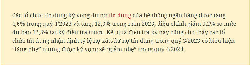 00:00 ngày 12/10/2023 | lượt xem: 449 Thanh khoản của hệ thống ngân hàng sẽ tiếp tục dồi dào trong quý 4/2023 Theo nhận định của các tổ chức tín dụng, thanh khoản của hệ thống ngân hàng trong quý 3/2023 tiếp tục duy trì trạng thái “tốt,” “cải thiện” hơn so quý 2/2023. Các tổ chức tín dụng dự báo tình hình thanh khoản sẽ tiếp tục dồi dào trong quý 4/2023 và cả năm 2023 so năm 2022.Huy động vốn toàn hệ thống tổ chức tín dụng được kỳ vọng tăng bình quân 3,2% trong quý 4/2023Vụ Dự báo, Thống kê (Ngân hàng Nhà nước Việt Nam) vừa công bố kết quả của cuộc Điều tra Xu hướng kinh doanh của các tổ chức tín dụng quý 4 năm 2023.Kết quả cho thấy các tổ chức tín dụng đánh giá tình hình kinh doanh của hệ thống ngân hàng trong quý 3/2023 chưa có sự cải thiện như kỳ vọng tại kỳ điều tra trước. Do đó, họ đã điều chỉnh thu hẹp kỳ vọng về tình hình kinh doanh và lợi nhuận trong thời gian tới với 66,7%-72,1% trong quý 4 và cả năm 2023 (thấp hơn tỷ lệ 70,3-74,8% của kỳ trước).82,6% tổ chức tín dụng kỳ vọng lợi nhuận trước thuế dự kiến tăng trưởng dương so với năm 2022; 13,8% tổ chức tín dụng lo ngại lợi nhuận tăng trưởng âm trong năm 2023 và 3,7% ước tính lợi nhuận không thay đổi.Các tổ chức tín dụng cũng nhận định, thanh khoản của hệ thống ngân hàng trong quý 3/2023 tiếp tục duy trì trạng thái “tốt,” “cải thiện” hơn so với quý 2/2023; đồng thời dự báo, tình hình thanh khoản sẽ tiếp tục dồi dào trong quý 4/2023 và cả năm 2023 so với năm 2022.Vào kỳ điều tra tháng 6/2023, các tổ chức tín dụng cho biết tiếp tục điều chỉnh giảm giá bình quân các sản phẩm, dịch vụ. Trong đó, giảm mạnh lãi suất biên hơn phí dịch vụ trong quý 3/2023 và dự kiến tiếp tục giảm trong quý 4/2023. Tính chung trong năm 2023 so với năm 2022, giá bình quân sản phẩm dịch vụ được dự báo sẽ giảm đáng kể nhưng có thể tăng nhẹ trong năm 2024 do phí dịch vụ dự kiến “tăng nhẹ” trong khi lãi suất biên được dự kiến tiếp tục “giảm nhẹ.”Cũng theo kết quả điều tra, tỷ lệ tổ chức tín dụng nhận định nhu cầu vay vốn của khách hàng trong quý 3/2023 là “cải thiện” đạt mức thấp hơn so với quý 2/2023 và thấp hơn mức kỳ vọng tại kỳ điều tra trước. Nhu cầu gửi tiền, sử dụng dịch vụ thanh toán và thẻ được nhận định tiếp tục “cải thiện” ở mức thấp trong quý 3/2023 so quý trước.Tuy nhiên, các tổ chức tín dụng dự báo nhu cầu sử dụng dịch vụ ngân hàng của khách hàng có thể “cải thiện” tốt hơn trong quý 4/2023 do kỳ vọng tình hình kinh tế tích cực hơn, ngành sản xuất, xuất khẩu dần phục hồi, trong đó nhu cầu vay vốn được kỳ vọng “cải thiện” nhiều hơn nhu cầu gửi tiền và . Trong cả năm 2023, nhu cầu sử dụng dịch vụ ngân hàng của khách hàng được dự báo “tăng” với tốc độ chậm lại so năm 2022.Huy động vốn toàn hệ thống tổ chức tín dụng được kỳ vọng tăng bình quân 3,2% trong quý 4/2023 và tăng 8,7% trong năm 2023, điều chỉnh giảm so với mức kỳ vọng 10,6% ghi nhận tại kỳ điều tra trước.“Chính sách lãi suất, tín dụng, tỷ giá của đơn vị” tiếp tục được 71%-75,7% tổ chức tín dụng đánh giá là nhân tố nội tại quan trọng nhất ảnh hưởng tích cực tới tình hình kinh doanh của đơn vị trong 2 quý liên tiếp (quý 2, 3/2023) và kỳ vọng trong cả năm 2023.Ngoài ra, các tổ chức tín dụng cũng cho rằng “Chính sách tín dụng, lãi suất và tỷ giá của Ngân hàng Nhà nước” tiếp tục là nhân tố khách quan quan trọng nhất giúp cải thiện tình hình kinh doanh của họ trong quý 3/2023 và cả năm 2023, sau đó đến “Cầu của nền kinh tế đối với của đơn vị” và “Điều kiện kinh doanh và tài chính của khách hàng”. Tác giả: Theo: nhandan.vn
